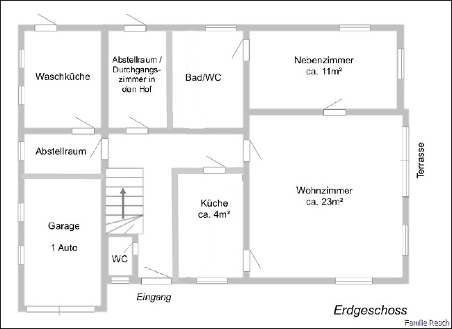 Grundriss Erdgeschoß Vom Wohnzimmer können Sie direkt auf die Terrasse hinausgehen - schon am frühen Morgen werden Sie hier von den ersten Sonnenstrahlen, die über das Gebirge kommen, begrüßt. Vielleicht haben Sie ja mal Lust auf ein gutes Frühstück auf der sonnigen Terrasse? |