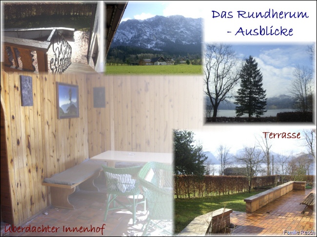 Das Rundherum "Ausblicke": Vom überdachten Innenhof hat man einen wunderbaren Blick auf das Höllengebirge - gleich oberhalb ist auch die Pension Resch zu sehen. Von der Terasse und vom seeseitigen Balkon können Sie den Ausblick auf die umliegenden Berge und den Attersee genießen. |